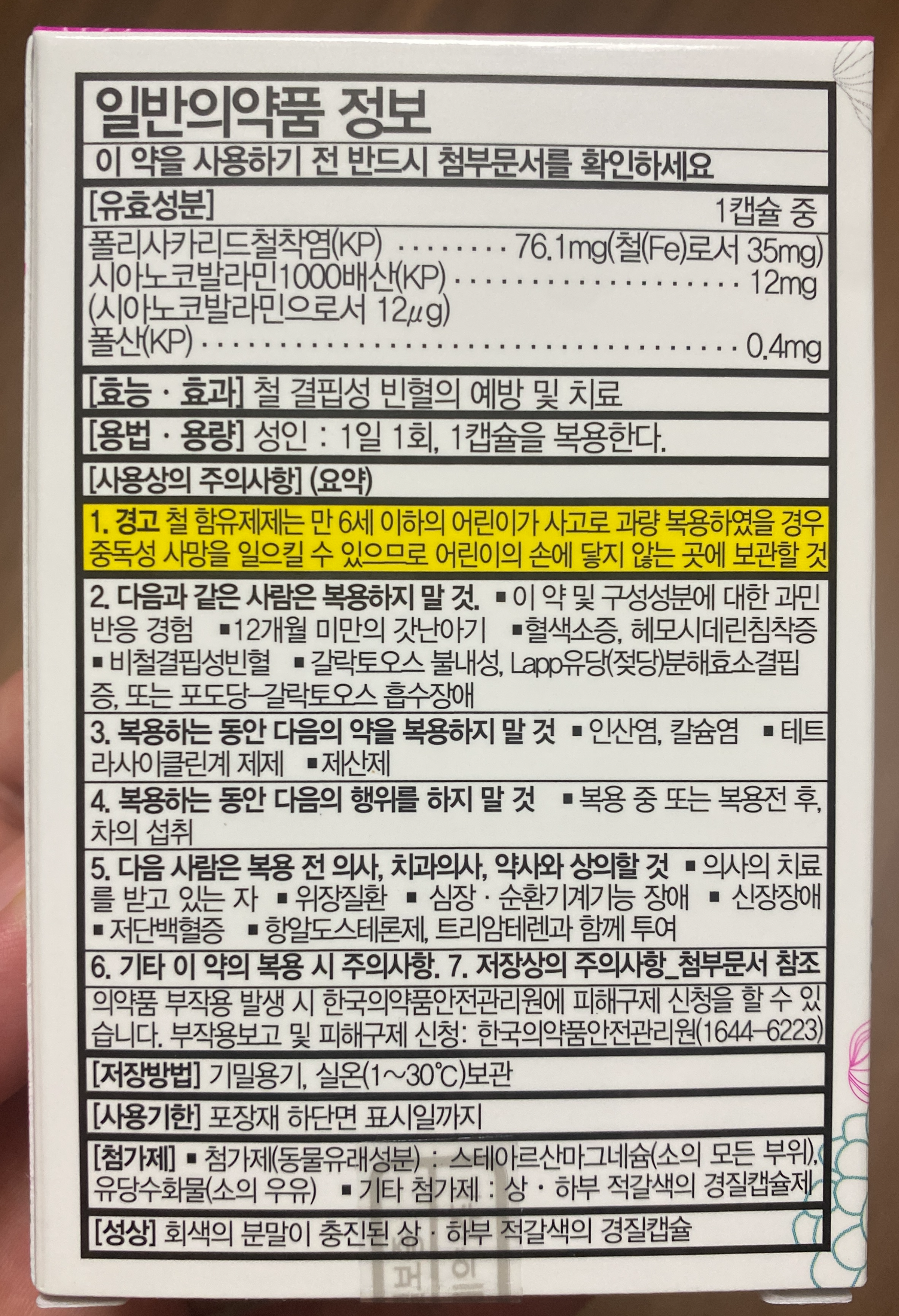 그리고 폴리사칼라이드철착염은 3가 유기착화합물 제제로 너무 많이 먹었을 땐 착염 된 게 100% 떨어지지 않고 그대로 대변으로 나가는 성질이 있습니다. 따라서 용법, 용량보다 많이 먹어도 크게 걱정하지 않으셔도 됩니다.