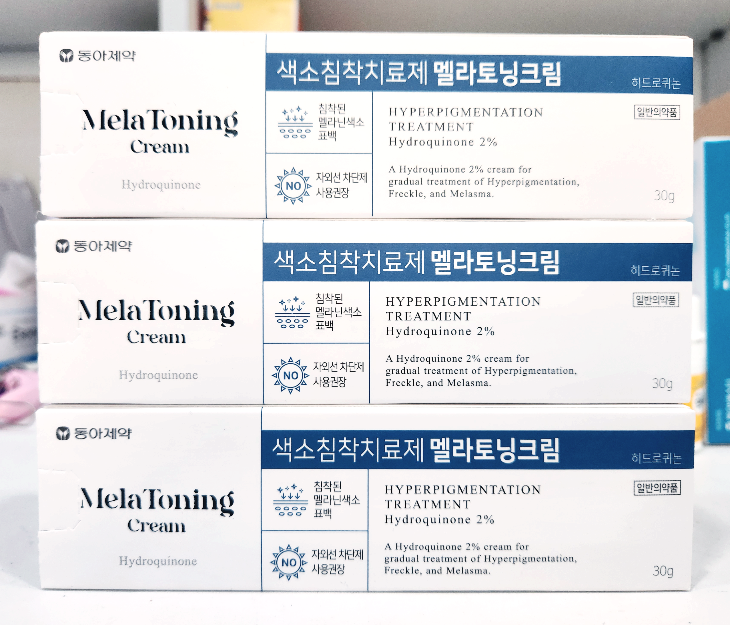 동아제약에서도 히드로퀴논 4% 제품인 멜라노사 크림이 있으며, 태극제약 역시 최근 2% 제품인 도미나라이트크림을 출시하였으니 참고하세요.