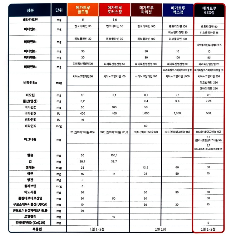| 메가트루 633정 120정(2~4달분) | 70,000~80,000원 | 583원~666원 |