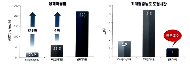 벤포티아민은 티아민, 푸르설티아민 대비 빠르게 흡수되고 높은 생체이용률을 보입니다.