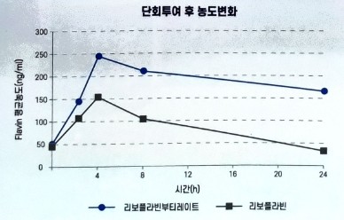 그 결과 최대 혈중농도가 절반이 되는 데 걸리는 시간(half-life)은 리보플라빈부티레이트는 24시간 이상, 리보플라빈은 13.4시간이 걸렸습니다.